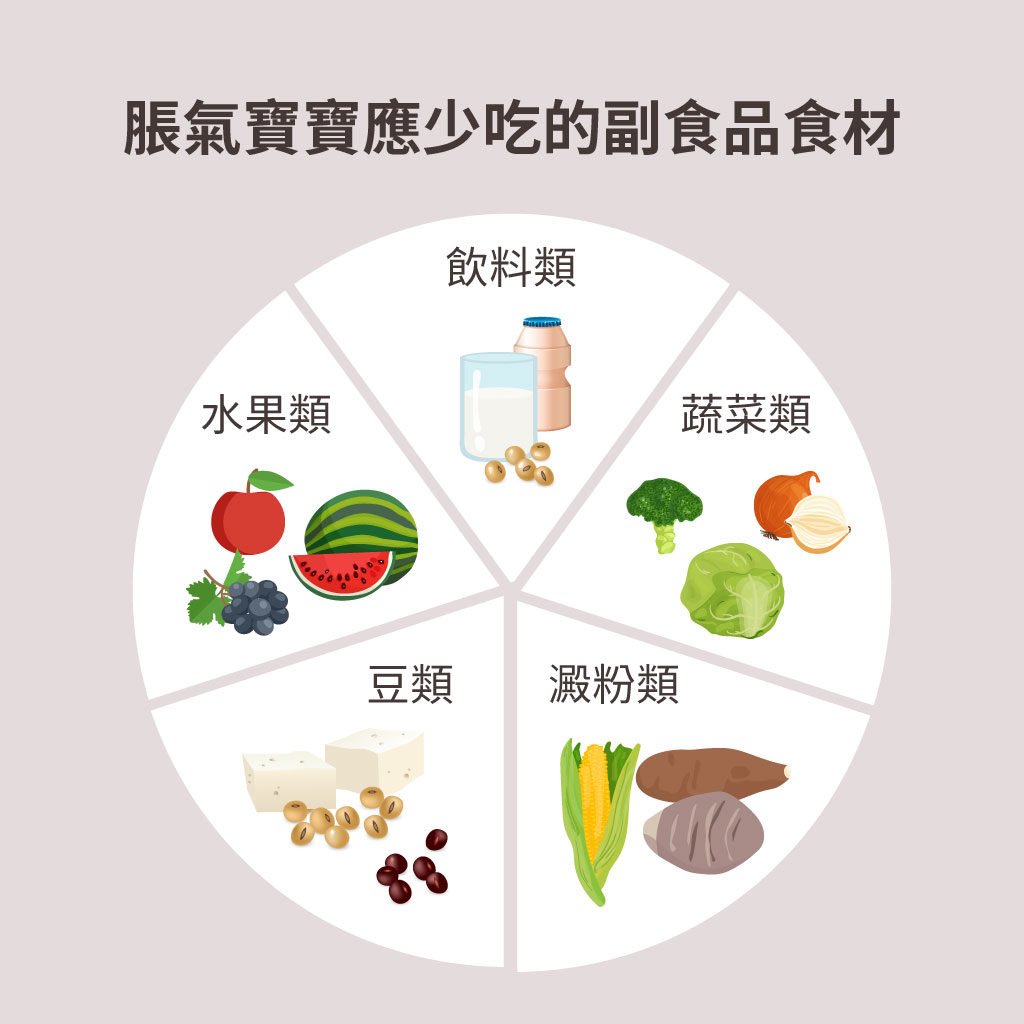 嬰兒奶粉是一種乳製品屬於產氣的食物,再加上已經開始吃副食品的寶寶,應避免一些容易產氣的食物,如:蘋果、地瓜、馬鈴薯、糖水等。